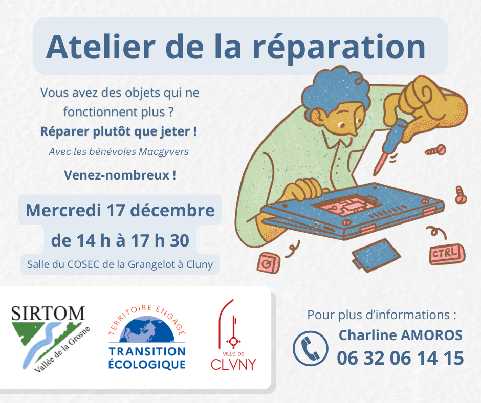 Le prochain atelier de la réparation des Macgyvers aura lieu le mercredi 17 décembre de 14 h à 17 h 30 au 9 rue Léo Lagrange à Cluny (salle du COSEC de la Grangelot).